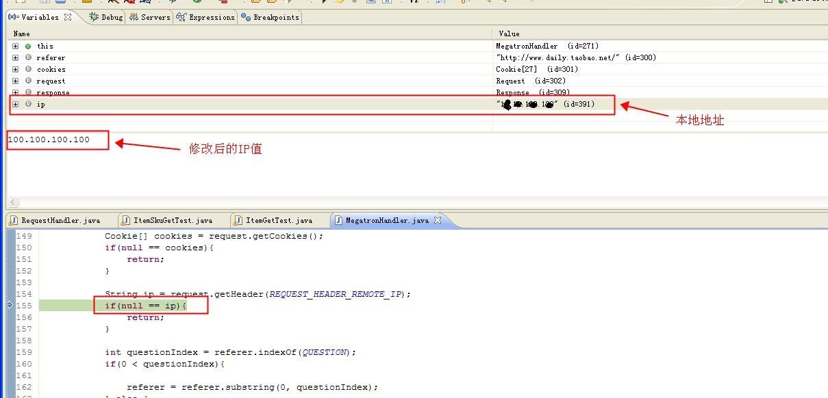 思路:通过本地发起Http请求,连接daily机或开发机,设置断点。当请求到达断点处,修改IP地址信息,模拟任意的IP地址请求。处理结果看返回信息