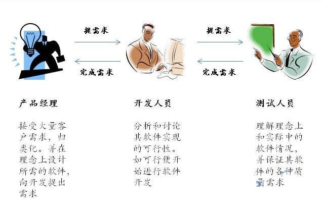 要理解测试工程师这个职位,那我们可以先从一条简单的软件开发流水线上来观察其所处的位置。一个软件的开发主要需要这三个方面的协作:产品经理,开发人员,测试人员。这是一个基本的流程,如下图便是他们之间的联系和职能关系图。