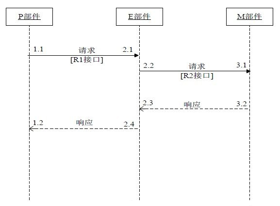 以下为某个处理的简化流程。P部件发出请求,E部件协议转换后转发给M部件,M部件进业务逻辑处理后返回响应给E部件。