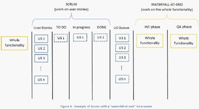 有时候,在Scrum中对用户故事进行测试的时候需要在后进行一些瀑布式的步骤。在这里我所阐述的情景是基于这样一种情况:在Scrum流程中,需要在Scrum流程的后阶段进行一些顺序性的步骤来对所开发的功能进行测试。这些步骤在我们的组织中是必须的,而且这些步骤是为了产品发布的瀑布式流程,因此,我们不得不处理在Scrum中进行瀑布式流程的情况。然而,据我所知,遇到这种情况并不只有我们。我们把这种情景叫做“Scrum和瀑布式的交互”(详见Michele Sliger的《Bridging the gap: Agile projects in the Waterfall enterprise》)。我认为这种情形应该是很常见的,因为在一个组织中Scrum的实施一般是循序渐进的,也是说会存在Scrum和瀑布式同时存在的时期。