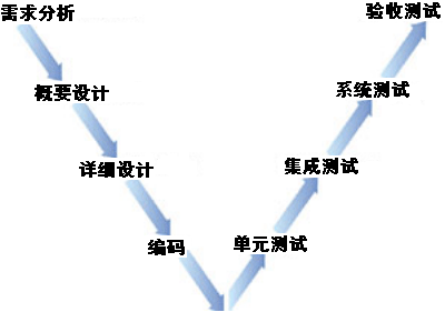 在模型图中的开发阶段一侧,先从定义业务需求开始,然后要把这些需求不断地转换到概要设计和详细设计中去,后开发为程序代码。在测试执行阶段一侧,执行先从单元测试开始,然后是集成测试、系统测试和验收测试。