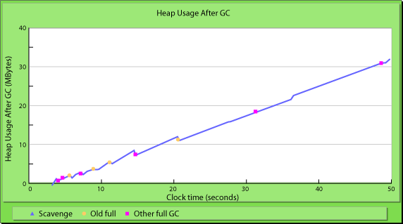 图 1 显示 MapLeaker GC 之后应用程序堆大小随着时间的变化图。上升趋势是存在内存泄漏的警示信号。(在真实的应用程序中,坡度不会这么大,但是在收集了足够长时间的 GC 数据后,上升趋势通常会表现得很明显。)