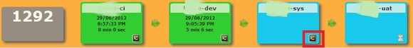 如上图,测试人员访问CI服务器,会看到这样的构建流水线,1292号版本已经在CI上运行通过(第一个绿色),并且被部署到DEV环境中(第二个绿色),SYS和UAT还没有部署1292号版本(蓝色)。