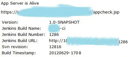 新功能发布到测试环境后,如果测试人员发现功能不对,想手工验证下当前测试环境的版本,也是可以的。只需要在浏览器输入“http://应用地址/appcheck.jsp”,能得到如下页面,
