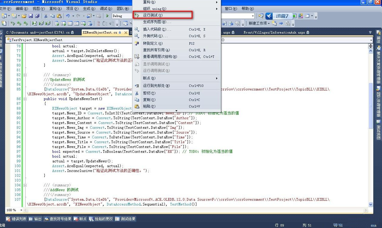 [DataSource("System.Data.OleDb", "Provider=Microsoft.ACE.OLEDB.12.0;Data Source=F:\crrGov\crrGovernment\TestProject\TopicBLL\XZBLL\XZNewsObject.accdb", "UpdateNewsObject", DataAccessMethod.Sequential), TestMethod()]。然后对测试方法进行更改:
