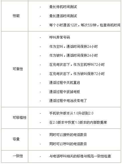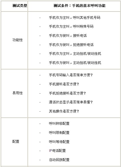 下面以大家熟知的手机呼叫功能为例,根据前面定义的测试类型,简单细化得到了一些测试条件。从该案例中,我们可以看到通过测试类型是如何帮助测试人员拓阔思路,从而提高测试覆盖率的(实际的测试用例要复杂和全面一些,这里只是作为一个例子进行讲解)。