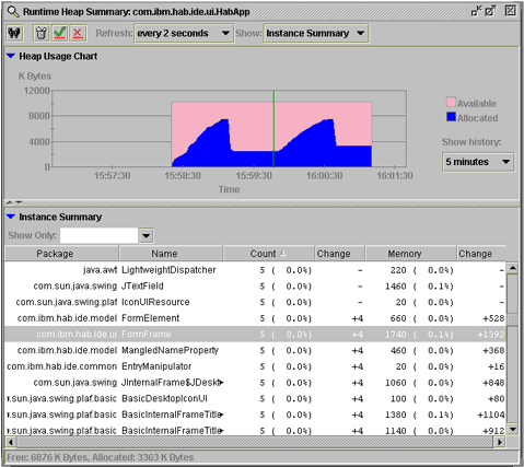 在堆使用情况图中,蓝色部分表示已分配的堆空间量。我启动 Java 程序之后它达到了一个稳定点,我强制垃圾收集器执行,这由绿线之前的蓝色曲线的一个骤降表示(这条绿线表示一个检查点被插入)。接下来,我先是添加而后删掉了四个表单并再次调用垃圾收集器。检查点之后的蓝色曲线的水平线比检查点之前的蓝色曲线的水平线高的事实告诉我们很可能出现了内存泄漏,因为该程序已经回归其只有一个简单可见的表单的初始状态。我检查实例确认了泄漏。总之,结果表明 FormFrame 类(表单的主 UI 类)的数量在检查点之后增加了四个。