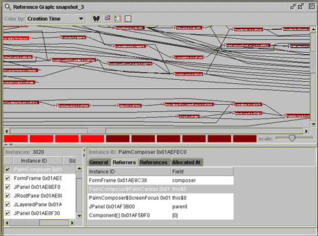要定位垃圾收集器工作时具体实例的引用,我使用了 JProbe 的引用画面,如下图所示,来断定哪些类仍然在引用已被删除掉的 FormFrame 类。这是调试这种问题的巧妙地方法之一,我通过它发现了很多不同的对象仍然在引用那些无用的对象。而通过试错来查明究竟是哪个引用者真正造成这个问题的过程却是相当耗时的。