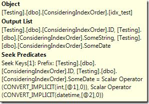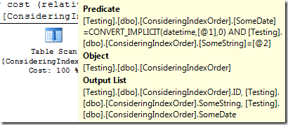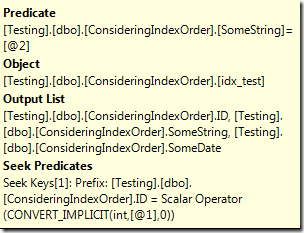 这个场景有点意思了。只能使用部分使用ID作为索引查找条件,因为SomeString列并不是索引的第二列。这个索引的第二列是SomeDate但查询没有按照SomeDate进行过滤。因此这个查询首先使用ID进行过滤,然后过滤后的列进行字符串比较来找到匹配的行。虽然这个操作是通过查找实现,但SQL Server仅仅使用查找找到ID,然后再将过滤后的行进行字符串比较。