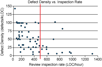 为了找到优化的检查率,我们将 缺陷密度 与评审者检查代码的 速度 进行了比较。得到的结果再一次落在了我们的预料之中:如果在评审您不花足够的时间,那么您不会发现太多的缺陷。如果评审者面临大量代码的压力,那么他不会每一行代码投入相同的注意力。他不能研究同一位置处更改的所有版本。