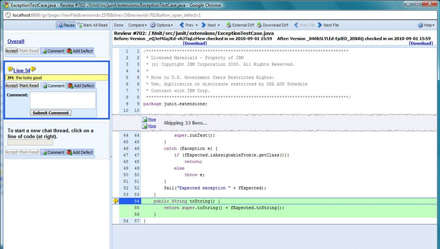 CodeCollaborator 是与 IBM? Rational Team Concert 工作流程相集成的代码评审工具。它将源代码评审与聊天形式的协作集成起来,从而使开发员从联系注释与私人代码行的繁琐活动中解放了出来。当程序员向工作项添加更改项进行评审时,在 CodeCollaborator 中将会自动创建评审,并分配适当的批准者。团队成员可以直接注释代码,与代码开发者聊天,并每一个问题进行协作,追踪错误(bug)并修复缺陷。整个过程不需要会议,打印,或者安排日程。