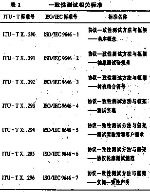 在过去的通信发展中,国际标准组织主要关注协议一致性测试,故此一致性测试开展早,也形成了很多有价值的成果,而其他三种测试仅仅作为商业测试的手段来满足具体测试者的需求。90年代国际标准化组织ISO制订的国际标准ISO/IEC 9646(ITU-TX.290系列)——“OSI协议一致性测试的方法和框架”,描述了基于OSI七层参考模型的协议测试过程、概念和方法,相应标准见表1。另外,还有ETSI ETS 300 406“测试和规范方法;协议一致性测试规范”。