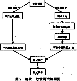 根据ITU-T X.290系列ISO/IEC-9646定义的一致性测试方法,测试标准主要包括五部分:①测试套结构和测试目的(Test Suite Structure and Test Purposes,TSS&TP):由相关标 准而得。它们为每个测试提供一个非正式易读的描述,集中于测试意图而不是如何实现。他 们通常在协议层上定义;②抽象测试套(Abstract Test Suite,ATS):是测试例的集合,测试例通过测试描述语言(如 TTCN、XML)描述;③协议实现一致性说明(PICS):PICS说明被测实施的要求、能力及选项实现的情况;④协议实施附加信息(Protocol Implementation eXtra Information for Testing,PIXIT):PIXIT提供测试必须的协议参数(例如特殊地址、计时器值等);⑤可执行测试套(Executable Test Suite,ETS):可以通过ATS简单快速的生成。协议一致性测试采用的工作流程如图2,其测试步骤如下:①静态测试:测试仪读取PICS/PIXIT文件并根据协议标准进行静态测试,检查IUT参数说明 是否符合标准。②动态测试:测试仪根据PICS/PIXIT文件和ATS生成ETS,然后执行ETS对IUT进行激励/响应 测试。具体采用的测试类型包括:本地测试方式、分布式测试方式、协同测试方式和远程测 试方式。③测试报告:对测试执行产生的测试记录文件进行分析,按照测试报告描述规格生成一致 性测试报告。协议一致性测试报告记录了所有测试案例的测试结果:成功(PASS)、失败( FAIL)、不确定(INCONCLUSIVE)。 ?