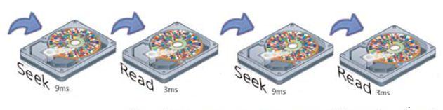 如果此时,在计算机的的磁盘中存在碎片(至于碎片如何产生,我这里也不花时间讲述,重点不在这里,而且也不难),那么数据的读取操作发生了变化。原本数据读取时的操作是“寻道-读取数据-读取数据…”,因为没有碎片,数据所在的扇区是连续的。如果有了碎片,那么读取的操作变为了“寻道-读取-寻道-读取-寻道-读取”,很显然,数据的读取延迟了。我们还是给大家看一个更加形象的图示: