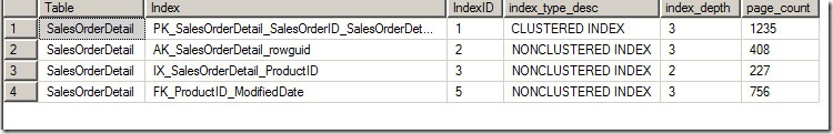 SELECT OBJECT_NAME(P.OBJECT_ID) AS 'Table' , I.name AS 'Index' , P.index_id AS 'IndexID' , P.index_type_desc , P.index_level , P.page_count FROM sys.dm_db_index_physical_stats(DB_ID(), OBJECT_ID('Sales.SalesOrderDetail'), 2, NULL, 'DETAILED') P JOIN sys.indexes I ON I.OBJECT_ID = P.OBJECT_ID AND I.index_id = P.index_id ; |