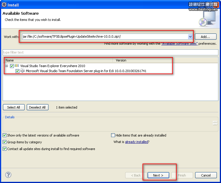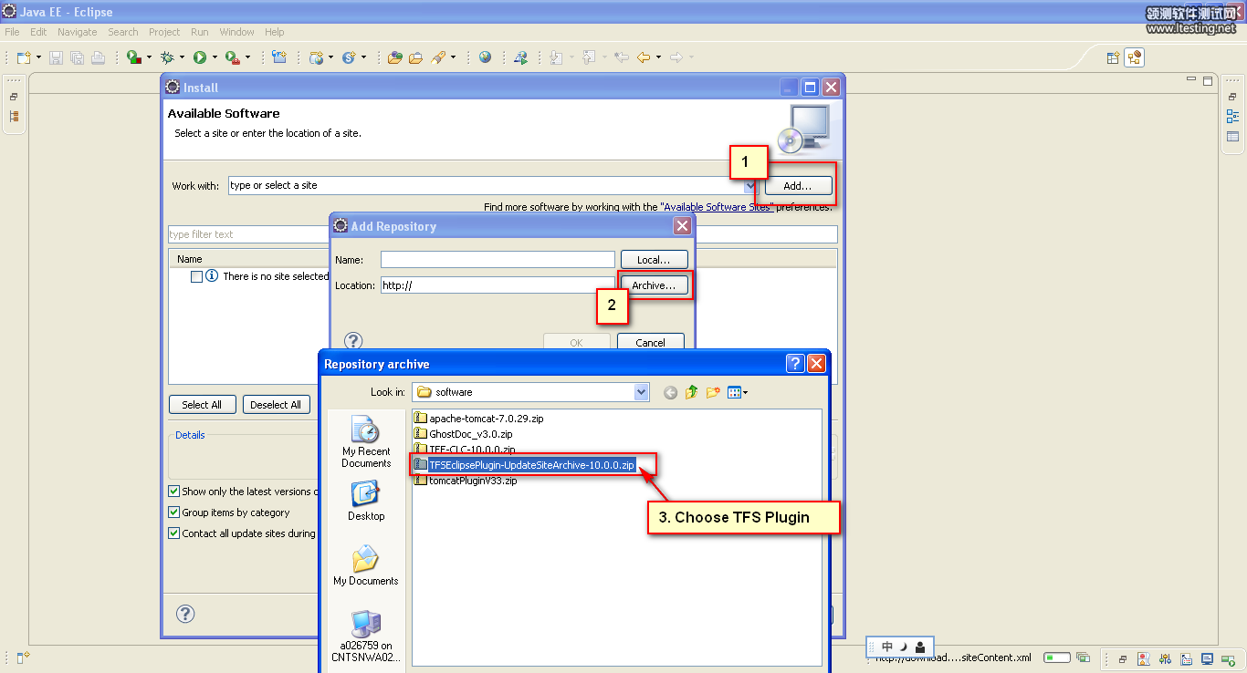 在Eclipse中安装插件的方法其实都一样,安装TFS的步骤如下: