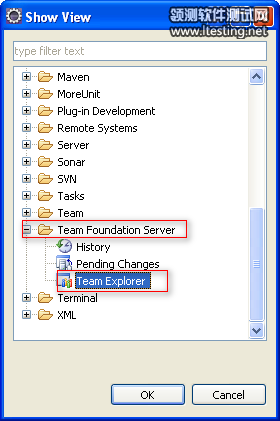 打开show views,在Windows->Show View->Others里。弹出如下窗口,选择Team Fundation Server下的Team Explorer。