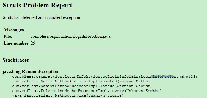 而这三层其实都有可能发生异常,比如dao层可能会有SQLException,service可能会有NullPointException,action可能会有IOException,一但发生异常并且程序员未做处理,那么该层不会再往下执行,而是向调用自己的方法抛出异常,如果dao、service、action层都未处理异常的话,异常信息会抛到服务器,然后服务器会把异常直接打印到页面,结果会如下图所示: