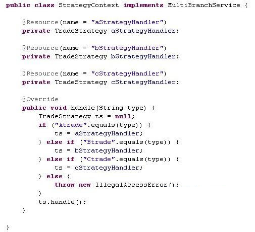 从代码本身来讲,这样写代码并不符合开闭原则(对扩展开放,对修改关闭),因为如果将来多了一种处理逻辑,需要新增一个private方法,然后在handle加个else if分支。对于这种情况可以采用策略模式解决,先定义一个策略的上下文,它只负责调用各种处理: