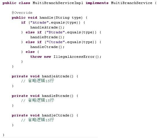 这种类型的代码在系统中较多地出现,有时候是以switch—case的形式,但更多的时候是根据条件的不一样选择不同的处理逻辑。当然现在的这个例子是简化后的,实际上handle中的选择分支更多,而private中的方法也不一定只有15行。对于这样的类和方法我们测试势必很难,因为重要的逻辑几乎在handleAtrade(),handleBtrade(),handleCtrade()里面,而这些方法在接口类MultiBranchService中是没有的。