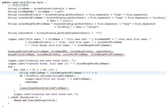 划红线的方法是这个类中的private方法,可以看到如果要对这个类的work()方法进行测试是多么困难,work()如果加上这些private方法大概有150多行,而且work()前面有一部分代码是去下载文件,单测初始化工作也不好做,因为后续的操作多次要处理这个文件,要覆盖各种情况需要准备不同情况的文件。