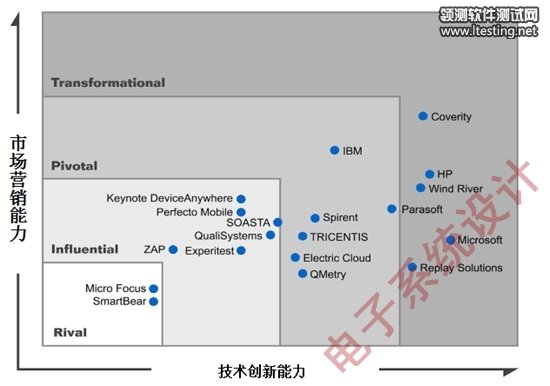 知名市场研究机构voke长期追踪研究软件测试工具市场格局。其研究报告指出,软件测试市场的赢家将是这样的提供商——软件测试厂商应当是深刻地理解到软件测试不仅关系到软件产品的质量,而且更关系到企业用户兑现其品牌承诺的能力。成功的软件测试提供商必力,voke机构向业界提供了“voke市场推动者格局”报告(图1)。