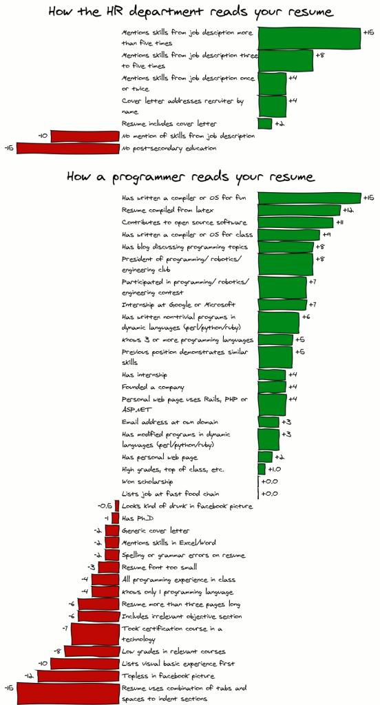 下面这个图片来源国外,是一个关于程序员面试时的简历,被人事部门和程序员本身评审的角度不同的图片。当然,这是一个从国外面试的视角制作的图片,不过,可以看出,其中很多东西都是和国内是相同的。让我们通过这个图片也来了解一下自身吧。