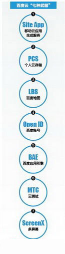 “百度的云平台将为移动互联网开发者提供全面的免费支持。”百度移动云事业部总经理李明远告诉《中国经济周刊》,“我们推出的‘七种武器’只是一个开端,未来会逐步将以前只提供给自身产品的基础能力对外开放、向外输出,变成各种开发者能够拥有的能力,也是说,百度会为整个移动互联网生态链提供完善的基础设施。”
