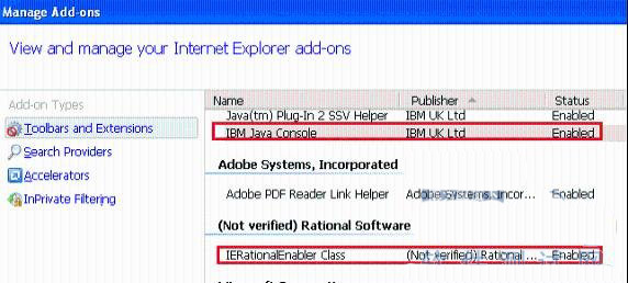 由于第一次正常启用后,RFT 及 JRE 的相应插件信息都记录在了浏览器中,所以当卸载安装浏览器后,需要打开浏览器的插件管理,检查原来的插件在新安装的浏览器中是否被禁用,如果被禁用,重新启用即可,如图 3 所示。