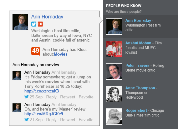 当Bing整合Klout后,用户搜索某个热点话题时,他们会像经常看到Facebook上的广告一样看到专家级的意见出现,当鼠标放在该专家的名字上,不仅该专家的Klout得分会出现,连同他们专长哪些领域也会显现。