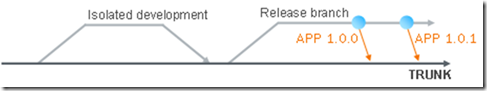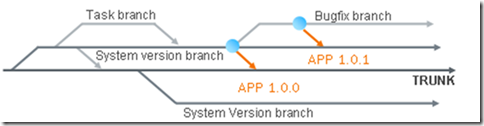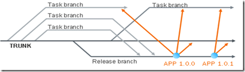 为每个发布建立分支,每个周期内的task分支需要合并到发布分支发布。
