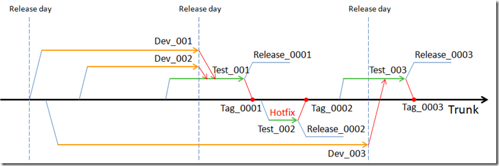 8、如果在测试分支测试过程中需要hotfix工作,则在复制一个新的测试分支进行hotfix,测试后发布。然后同时合并入原测试分支和主干,并在主干上做标记。此过程未在上图中画出。