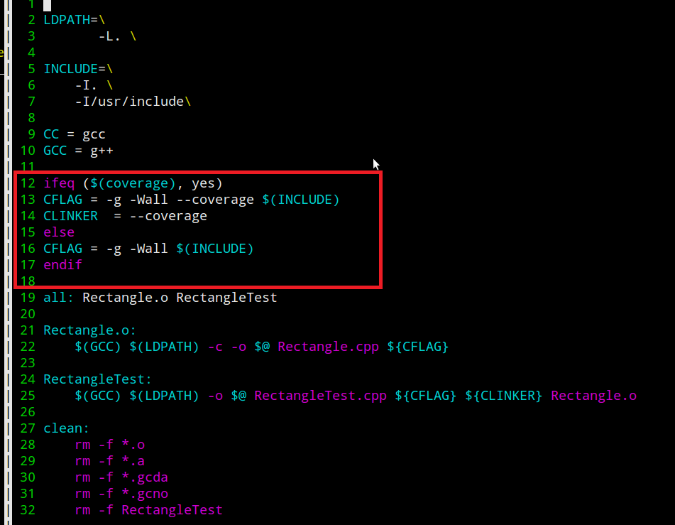 3)Makefile比较简单,主要支持在coverage=yes的参数支持。 可以使用-fprofile-arcs -ftest-coverage 选项,这里为了简化使用了 –coverage。