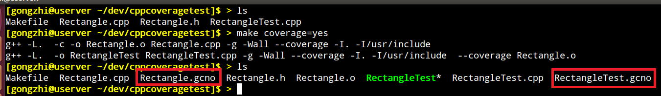 由于Makeifle中已经支持了coverage=yes选项,直接运行 “make coverage=yes”,这个时候会产生测试程序,并同时生成gcno文件(关于gcno文件的详细解释,参见第三部分背后原理),如下图,