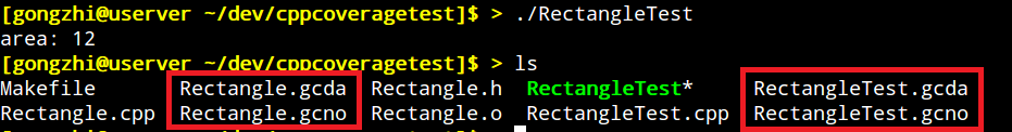 运行./RectangleTest 测试程序,运行结束后,会针对所有的cpp源代码文件产生相应的*.gcda文件(关于gcda文件的详细解释,参见第三部分背后原理),如下图