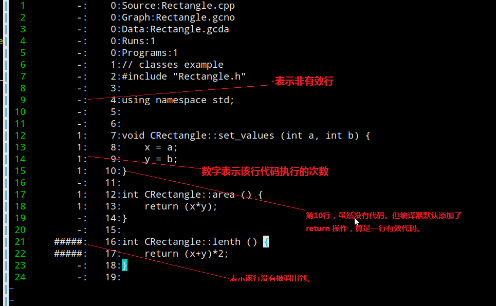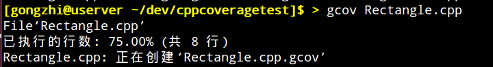 针对某个源代码文件,例如 Rectangle.cpp,执行”gcov Rectangle.cpp” 会产生Rectangle.cpp.gcov文件。