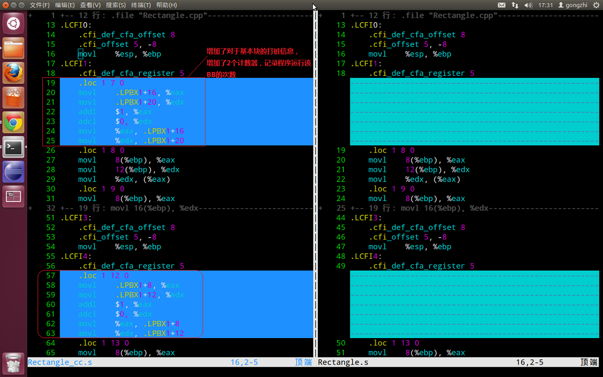 vimdiff Rectangle.s 和 Rectangle_cc.s,如下图