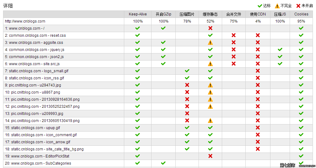 评估方法:服务器是否返回了"Transfer-encoding: gzip"响应头。假如全部压缩是满分,否则:得分=满分x(-全部gzip后节省的比例%)