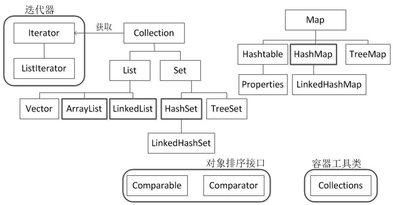 JDK API中专门设计用来存储其他对象的类,一般称为对象容器类,简称容器类,这组类和接口的设计结构也被统称为集合框架(Collection Framework)。集合框架中容器类的关系如下图示