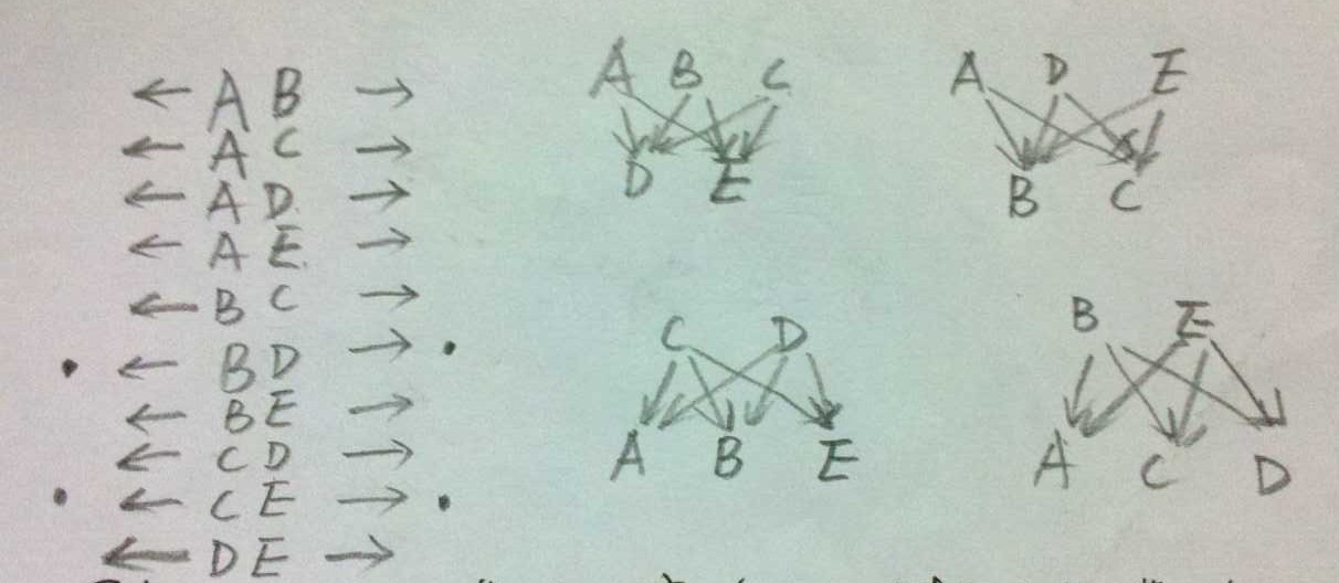 1、宿舍内5个同学一起玩对战游戏。每场比赛有一些人作为红方,另一些人作为蓝方。请问至少需要多少场比赛,才能使任意两个人之间有一场红方对蓝方和蓝方对红方的比赛?答案为4场,参考如下图,作者doc_sgl:
