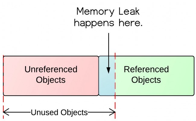 从图中可以看到被引用对象和未引用对象(的范围)。未引用对象可以被垃圾回收机制回收,而被引用对象不能被垃圾回收机制回收。未引用对象当然是没有使用的,因为没有其他对象引用了它。然而未使用对象并不都是未引用的。某些未使用的对象仍然被其他地方引用!这是内存泄漏起因。