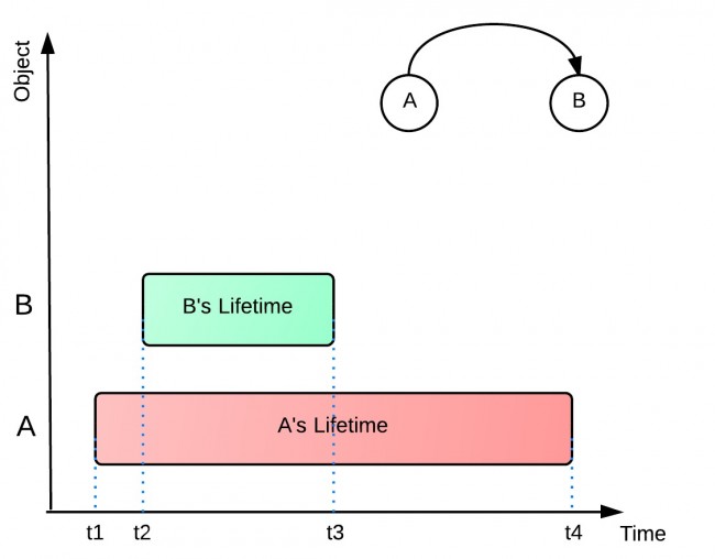 让我们来下面的这个例子,看看为什么会发生内存泄漏。在如下例子中,A对象引用了B对象。A的生命周期(t1-t4)比B的生命周期(t2-t3)要长的多,当B不再在应用中被使用,A仍然持有对B的引用。这样一来,垃圾回收机制不能从内存中移除B。这很有可能导致内存溢出问题,因为如果其他很多对象像A一样,那么内存中将会有很多不能被回收的对象,这将消耗大量内存空间。