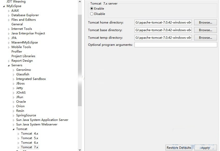 4、下载完成后,进入上图中的服务器位置,点击home directory后面的browse选择解压缩后的tomcat位置,如我的解压缩后的目录为:G:apache-tomcat-7.0.42-windows-x64apache-tomcat-7.0.42,选择好以后,下面的2个自动会加入。