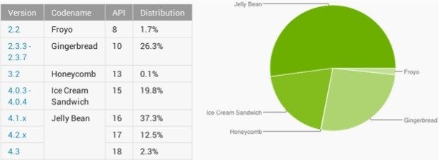 这些数据统计的基础是截至2013年11月1日的七天中访问谷歌应用商店Google Play的智能手机和平板电脑。这些数据显示,4.1.x 、4.2.x和4.3版本的果冻豆支持着52.1%的Android设备。新版Android 4.4 KitKat并未出现在列表中,因为它和运行它的新款Nexus 5智能手机上个月末才推出。