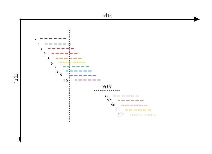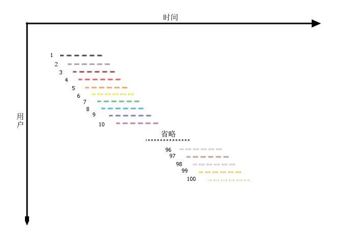 假设我们已经分析得出,系统的使用压力集中在2个小时内,在这个时间段内共有100个用户访问(活跃用户),且压力是平均分布的(否则可以说压力集中在更小的时间段内了),平均每个用户使用系统的时间是30分钟(活跃时间),那么我们可以画出下面一张图来表示服务端所承受的压力。