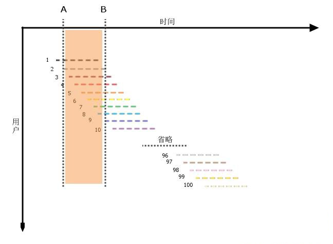 接下来只需简单的算术可以了,100个用户访问平均分布在2小时内,AB时长为平均用户活跃时间,即30分钟,那么在AB区域内有100*30min/2h=25个用户访问。这25个用户在B时刻都可能会与系统发生交互,对系统照成压力,虽然只是一种理论上的可能性。