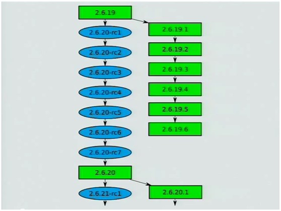 一个新版本2.6.20的发布过程如下图二。在每一个版本开始时,Linus会打开合并窗口(merge window),从那时起,被认为是可靠稳定的代码会被合并到内核主线,新的功能或驱动等得以加入进来,合并窗口会开启两周,然后Linus会宣布窗口关闭,并发布第一个rc版本,如下图2.6.20-rc1。此-rc1版本的发布意味着新功能的加入已经完成,以后再加入的补丁只能是修复问题,以确保此版本的稳定,但也有即少数包含新功能的补丁会被认为是不友好的。问题修复的代码不断进入主线,Linus接下来大约每周发布一个新的rc版本,通常会在6-9个rc版本后认为此版本已经稳定并且终发布2.6.20版本,再进入下一个三位版本的迭代。发布之后,此2.6.x版本移交给稳定组(stable team),稳定组时而会再发布2.6.x.y版本,每个四位版本的发布会有两个条件:(1)修复重大的bug;(2)该补丁也已被融入到下个三位版本开发的主线中了。稳定组通常维护一个稳定版本6个月左右,之后由使用该版内核的发行版发行商负责。
