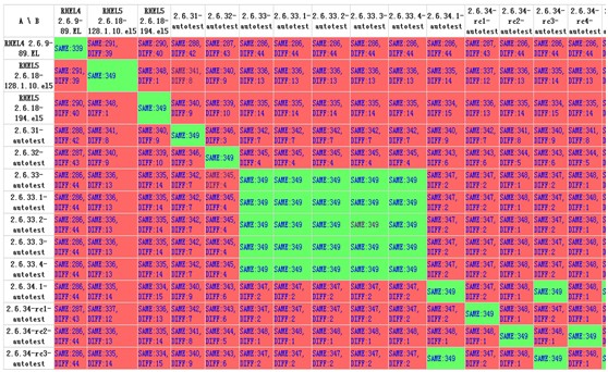 CrackerJack 是一个主要负责linux kernel兼容性测试的项目,找出不同内核版本系统调用的diff情况,已支持317个系统调用。它也是使用Autotest框架执行,diff结果是个矩阵可见下图五或者网址http://ossipedia.ipa.go.jp/crackerjack/compare_results.html。Diff比较是智能的,并非单独地比较输出结果,比如time时间调用每次系统返回都是不一样的,比较时是检查两次调用之间的时间差。