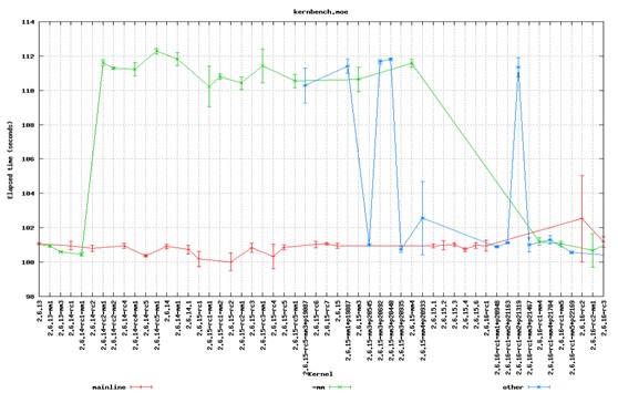 7、性能测试。Linux kernel对性能要求也比较高,性能测试通常要注意的几点:(1)好是利用benchmark,以取得可信数据;(2)避免I/O缓存因素,缓存对性能影响较大;(3)确保测量环境的稳定性,特别是比较前后版本时。Autotest中也包含性能测试自动化,一次升级导致的性能问题和修复如下图六所示,2.6.14-rc2-mm1版本与2.6.14-rc1-mm1版本相比执行时间由101增加到了111,性能降低了10%,直到2.6.16-rc1-mm4版本才修复。