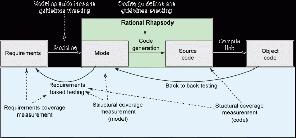 从文本需求到可用于代码生成的设计模型的完善步骤将通过执行基于与系统需求的模型级测试加以验证,此验证过程将利用 IBM Rational Rhapsody 动画通过模型模拟完成。这种测试也称为模型在环(Model-in-the-Loop,MiL)测试。生成的代码可在计算机上验证,方法是执行 MiL 过程中的相同测试用例,但不包含 Rational Rhapsody 动画。这种测试也称为软件在环(Software-in-the-Loop,SiL)测试。MiL 与 SiL 的测试结果将执行自动等效检查(对比测试),以验证结果。此外,还可在目标处理器上执行一组测试来补充此类验证,这种测试称为处理器在环(Processor-in-the-Loop,PiL)测试。模型和代码的测试执行提供了结构化的覆盖率度量,可评估测试的完整性,避免包含不必要的功能。需求覆盖率是在测试用例的执行过程中度量的。